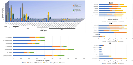 图4. 七个Cypripedium叶绿体基因组中的重复序列的分析。