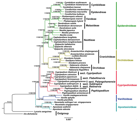 图5. 基于叶绿体基因组数据(超级条形码)构建的47个兰科植物的系统发育树。