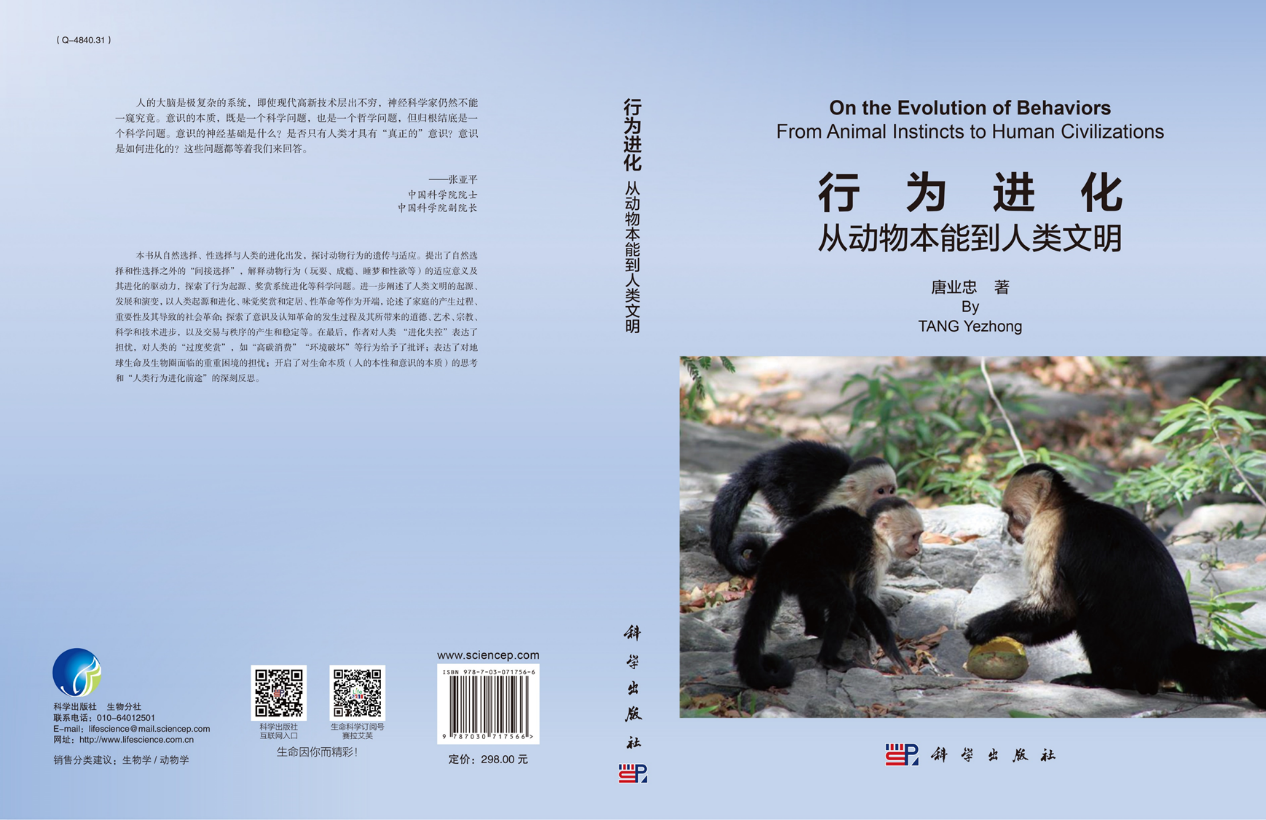 由动物行为与仿生项目组的唐业忠研究员独立完成的专著《行为进化:从动物本能到人类文明》近日由科学出版社出版发行。