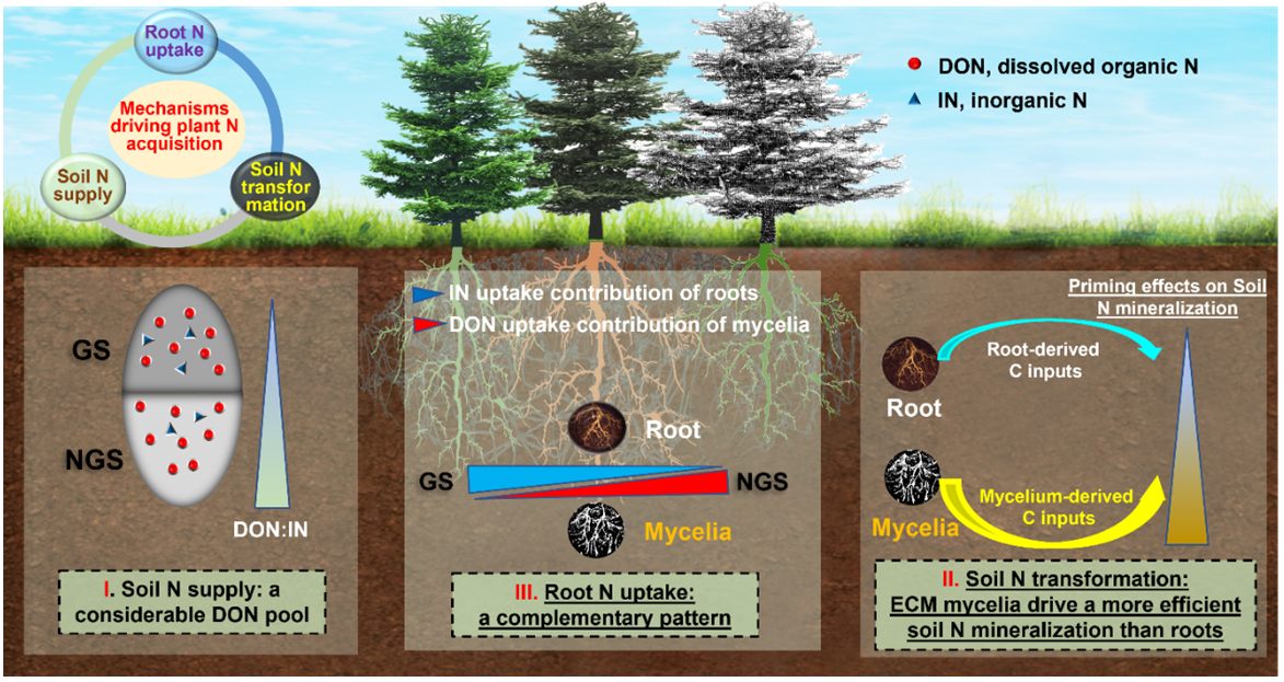全球变化下森林生产力与群落稳定性的地下养分维持机制一直是森林生态学研究亟待解决的关键科学问题和前沿热点,但迄今认知仍十分有限。特别地,高纬度/高海拔分布的高寒针叶林由于受低温、季节性冻土、低养分有效性、短生长季等特征所影响,使得这类针叶林表现为典型的氮(N)受限。但作为区域生态演替形成的顶级群落,高寒针叶林却具有稳定的林分生产力和群落结构。这引出一个重要问题,在N长期受限且无外源N添加情景下,高寒针叶林通过何种养分获取策略来维持树木生长与林分生产力?基于这一前沿基础科学问题与林业管理现实需求,中科院成都生物研究所森林生态过程与调控项目组以西南典型的高寒针叶林为研究对象,以根际界面为核心,重点围绕(i)N养分供给特征---(ii)N转化过程---(iii)N养分吸收等关键环节,聚焦森林生产力地下养分维持策略,从根际这一独特视角,系统揭秘了高寒针叶林生产力稳定的根际养分维持机制。