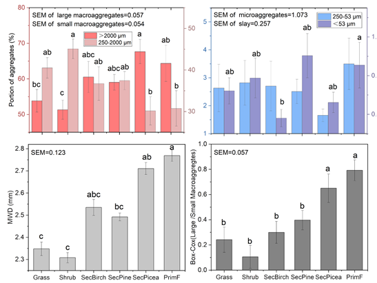 1 次生植被演替过程中土壤团聚体粒径占比(左上和右上)、平均重径(MWD)(左下)和团聚体比例(右下)