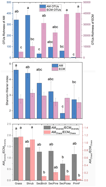 2 次生演替过程中土壤丛枝菌根(AM)和外生菌根(ECM)真菌群落的丰富度()、多样性()AMF / ECM多样性比值()