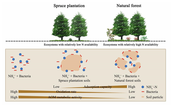 土壤中无机氮是所有植物体都必须的营养元素。通常认为亚高山森林土壤的低养分有效性受氨氧化细菌丰度和的多样性影响。然而,在农业和水生生态系统中,已有研究发现细菌-固体界面作用可以调控细菌的代谢活性和生物地球化学循环过程。忽略界面作用变化可能引起的土壤无机氮有效性的差异,很大程度上限制了对森林氮有效性利用策略和生态系统氮循环的认知水平。