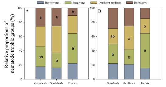基于此,本研究以川西亚高山森林不同次生演替阶段(草地-灌丛-森林)为研究对象,采集各演替阶段0-10cm和10-20cm土层的土壤样品,测定土壤线虫群落结构并分析其影响因子。研究结果表明:1)森林演替过程中,土壤线虫群落结构趋于丰富和稳定,食真菌线虫多样性显著升高,而植食线虫多样性显著降低;2)部分线虫属丰度与森林演替阶段显著相关,具有作为不同演替阶段指示生物的潜力,如Helicotylenchus、Tylencholaimus等;3)森林演替过程中,不同土层的土壤线虫群落组成的变化规律存在明显差异,在0-10cm土层,土壤线虫群落结构主要受土壤硝态氮含量和pH值显著调控,而在10-20cm土层,土壤线虫群落结构主要受土壤有机碳含量显著调控。本研究揭示了川西亚高山森林演替过程中土壤线虫群落的分布格局及驱动因素,对深入理解亚高山森林演替的地下生态学过程以及进一步探究亚高山森林演替的地下驱动机制具有重要意义。