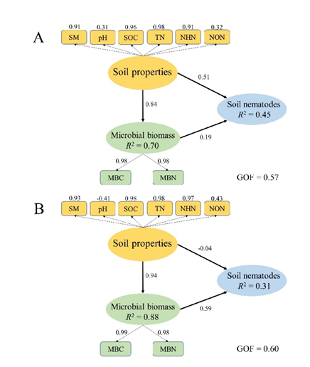 图2 基于PLS-PM分析土壤性质和微生物量对线虫群落的直接和间接影响