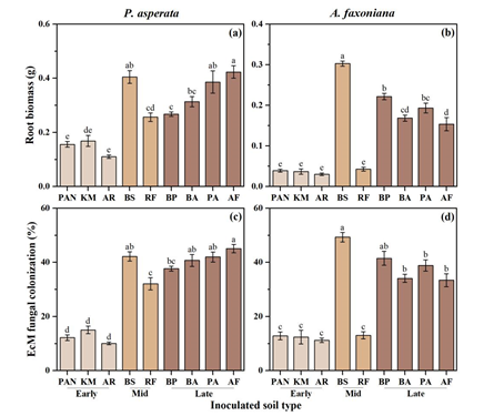 基于此,本实验采集川西亚高山森林不同演替阶段优势植物(3种草本、2种灌木和4种乔木)的根围土壤,作为不同来源的土壤微生物遗留物接种到灭菌迹地土中,消除土壤理化性质的影响。在混合土壤中分别种植粗枝云杉和岷江冷杉幼苗,室内培养13个月后收获幼苗生物量,测定根系形态、菌根定殖率和土壤无机氮含量,同时采用高通量测序技术比较不同根系样品的真菌群落组成、探测类型并分析其调控机理。研究结果表明:1)演替中期灌木和后期乔木的土壤微生物遗留物有利于根系EcM的定殖,提高根系对土壤无机氮的吸收并促进幼苗生长;2 不同演替阶段来源的土壤微生物有利于根系子囊菌门和具有“短距离”探测类型EcM真菌的定殖,其中演替前期草本和中期灌木的土壤微生物促使更多Trichophaea, GeoporaHebeloma在根系定殖,而演替后期乔木的土壤微生物有利于根系Wilcoxina (宿主特异性低;对碳水化合物需求较少;降解几丁质,提高土壤氮素有效性)的积累;3)树苗根系生物量与EcM短距离探测类型的相对丰度呈显著正相关。综上所述,土壤微生物遗留效应通过调节根系EcM定殖率、群落组成和探测类型来影响针叶树幼苗的生长。这些结果为深入了解亚高山森林演替进程中不同土壤微生物对幼苗定居的地下驱动机制提供直接的实验证据支撑。