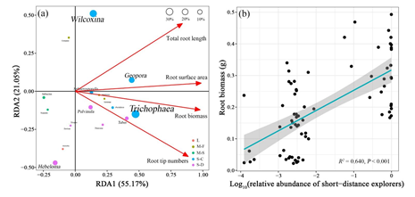 2 基于RDA分析EcM探测类型与根系生物量和形态的关系(a),短距离探测类型的相对丰度与根系生物量间相关性