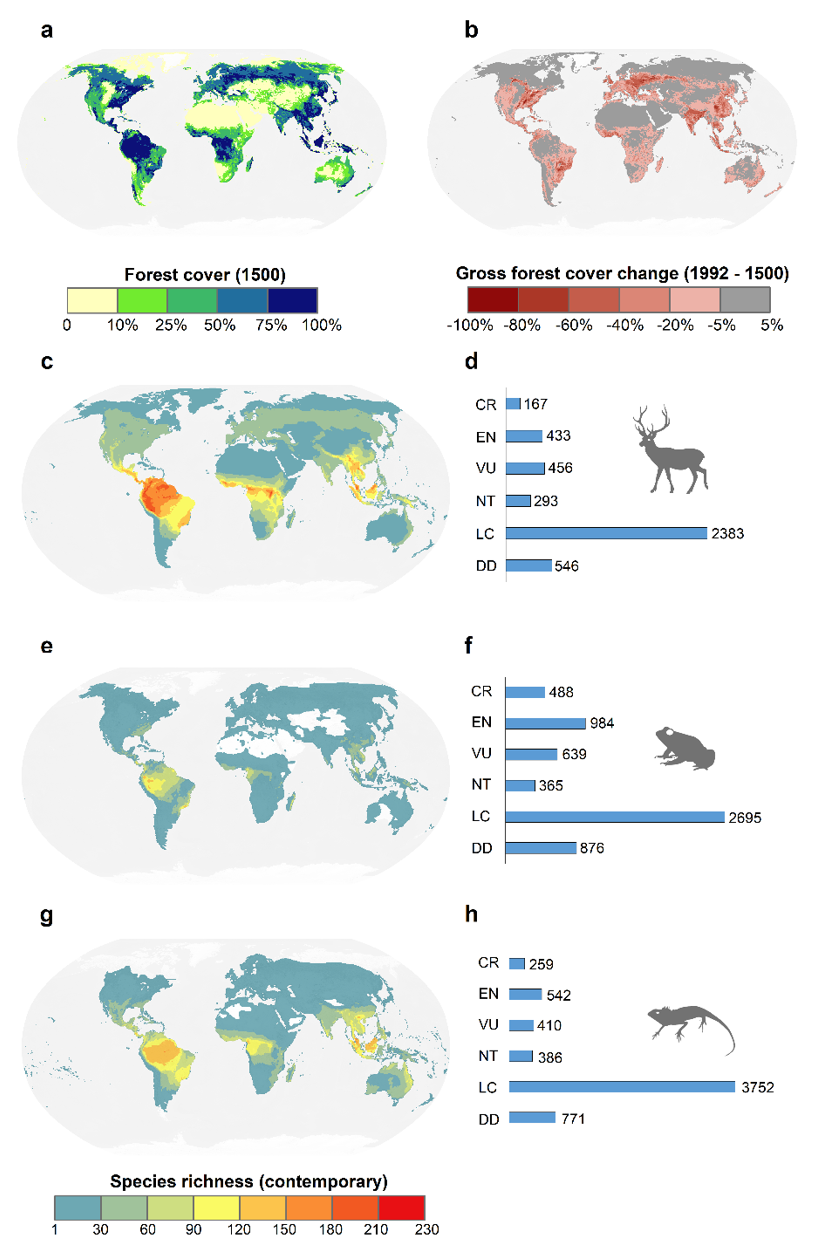 图2 全球森林覆盖变化及林栖陆生脊椎动物的丰富度格局