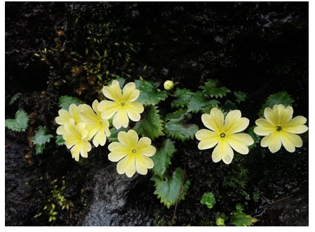 卧龙报春(图2)为多年生草本植物,生长于海拔3400m左右的高山灌丛与草甸交界区域的陡峭岩壁上,花期5-6月,果期8-9月.目前仅在卧龙丫头子岩窝发现1个分布点(居群),种群数量、分布范围、受干扰情况等有待进一步调查研究;参照IUCN(世界自然?;ち耍┑谋曜?,“卧龙报春”被初步评估为DD级(数据缺乏)。