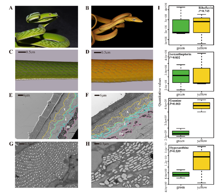 科研团队以野外常见的绿瘦蛇的绿色和黄色个体为研究对象,通过透射电镜成像发现,两种体色的绿瘦蛇在皮肤色素细胞,尤其是虹彩细胞的排列和形态上存在着明显差异,黄色个体的皮肤中含有更为无序和相对较厚的虹彩细胞嘌呤晶体;同时,皮肤组织的非靶向代谢组也显示了相同线索,这提示虹彩细胞的形态差异可能是绿瘦蛇两种体色差异的表型基础。