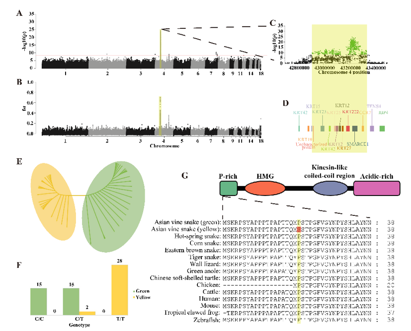 该研究成果以“Genetic mapping and molecular mechanism behind color variation in the Asian vine snake”为题发表于领域内国际知名期刊“Genome Biology(IF=17.906)”,并被选为Featured article。博士生唐晨阳为论文第一作者,四川大学华西第二医院张小虎副研究员、北京大学生命科学学院徐霄副研究员为共同第一作者;中国科学院成都生物研究所李家堂研究员为论文通讯作者。本研究工作得到了中国科学院战略性先导科技专项、国家自然科学基金等项目的支持。