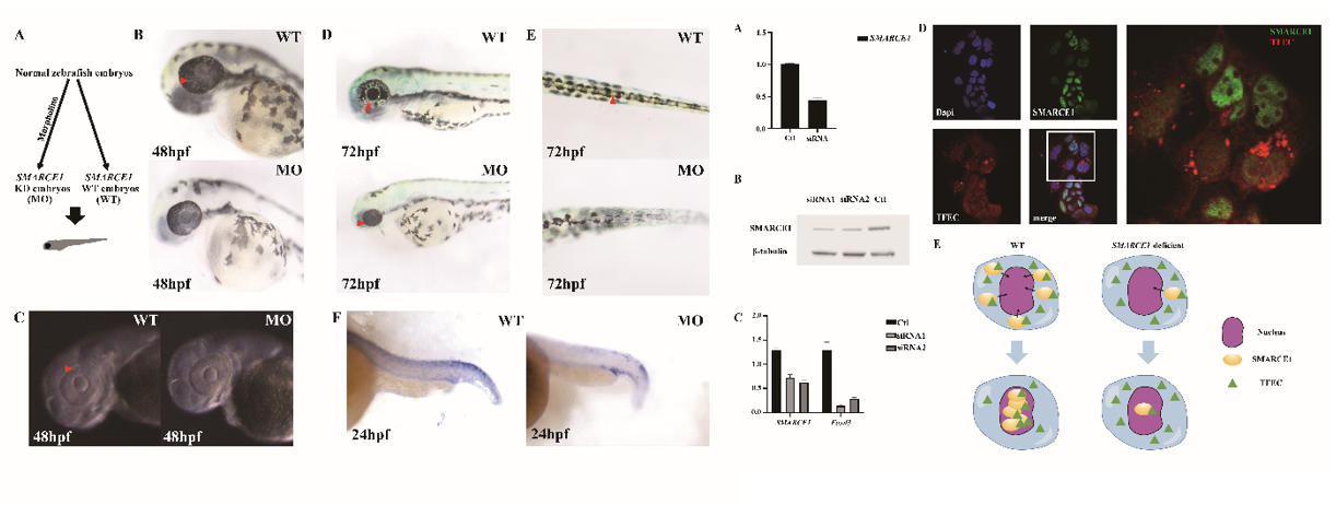 利用斑马鱼胚胎模型,将候选基因SMARCE1敲降后发现,胚胎虹彩细胞发育产生了明显异常,同时基因TFEC的表达也受到了影响,这提示了基因SMARCE1与虹彩细胞发育过程的重要联系。进一步的,研究构建了敲降SMARCE1的细胞系进行免疫荧光染色实验,结果发现,TFEC向细胞核的招募受到阻碍,可能是由SMARCE1与TFEC的结合异常导致的。SMARCE1突变导致结合TFEC功能异常,并最终影响色素细胞,特别是虹彩细胞的发育,进而导致了颜色的差异。