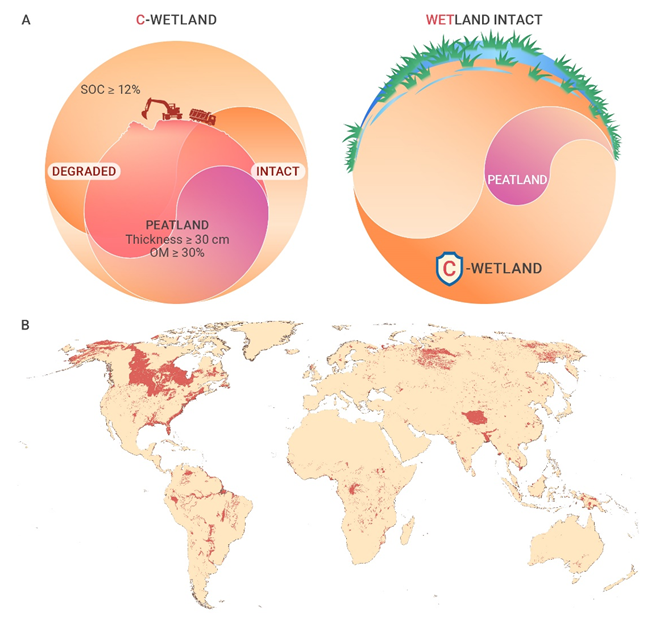 中国科学院成都生物研究所高寒草地与湿地项目组的陈槐研究员团队长期从事于泥炭地的碳动态研究,在此背景下,陈槐研究员以基于碳属性的“有机土壤物质”(“organic soil material”) 这一概念取代了泥炭”(“peat”) 这一资源属性的概念,构建了碳湿地这一新框架,强调保护土壤有机碳而不是消耗土壤有机质。有机土壤物质被定义为土壤有机碳大于12%的土壤 (按土壤干重计算),并且最近的全球泥炭地评估报告也部分采用了这一标准。另一方面,从保护有机土壤物质的角度来看,定义碳湿地也不应考虑积累厚度。基于上述理由,陈槐研究员创造性地提出了一个碳湿地 (C-wetland)”的概念,意指土壤有机碳不低于12%的湿地生态系统。基于全球土壤有机碳数据库 (FAO) 和全球湿地分布数据库 (GLWD-3),初步构建了全球未退化碳湿地的全球分布图。全球碳湿地约为570739万平方公里,占世界湿地面积的70%以上 (不包括内陆水域)。如果考虑到退化碳湿地,分布面积会更大。碳湿地如此巨大的分布面积进一步凸显了湿地作为碳汇和碳库的重要性,印证了保护土壤碳库应成为湿地保护的重要优先选项之一。