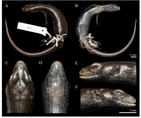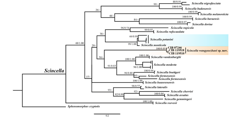 近日,中国科学院成都生物研究所李家堂研究员课题组依据采自我国四川省汶川县与理县的1号幼体和13号成体标本,基于比较形态学与分子系统学研究结果,发现该种群与其他已报道的滑蜥属物种均有明显差异,应系一未描述新种,将其命名为汶川滑蜥scincella wangyuezhaoi sp. nov.(图1)。新种以著名的两栖爬行动物学家王跃招先生的名字命名,以此向其对中国两栖爬行动物尤其是滑蜥属物种研究作出的卓越贡献表达敬意。新种模式产地为中国四川省汶川县,目前仅见于四川省汶川县与理县,以前部分产地的标本曾被误定为康定滑蜥。该新种的发现对横断山区的生物多样性及其保护有重要作用,将我国的滑蜥属物种数增加至12个,并提供了中国滑蜥属的形态检索表。