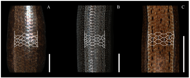 4  汶川滑蜥S. wangyuezhaoi sp. nov.与康定滑蜥S. potanini、山滑蜥S. monticola的侧纵纹间背鳞行数比较