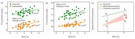 图2 新鲜叶与衰老叶氮、磷浓度随温度的变化。(a)和(b)为本研究中的针叶树,(c)为针叶树与全球和局地尺度研究的比较