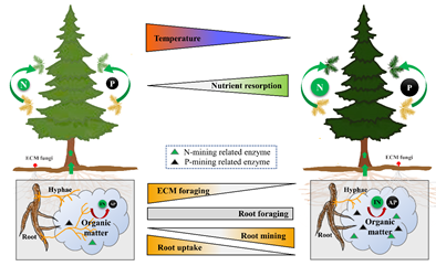 陆地植物生长普遍受到土壤养分(特别是氮、磷)限制。因此,植物如何吸收和利用这些限制资源,尤其是不同器官(叶片、根系)之间如何协调是生态学研究的热点。植物一般通过根系自身和菌根真菌来获取土壤养分,而叶片在衰老之前会重吸收这些限制性的养分,即叶片重吸收策略。植物地上和地下的这两种养分策略对多变环境下植物生长与生态系统功能稳定及其对全球变化的响应具有重要生态学意义。然而,以往研究大多仅关注根系和菌根真菌的养分吸收策略,或者仅探究植物地上叶片的养分回收特征。相应地,目前人们对于植物如何协调地下与地上的这些养分策略来适应环境变化仍知之甚少,特别是在养分限制程度高,且外生菌根(Ectomycorrhizal, ECM)高度共生的高寒针叶林生态系统中。