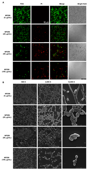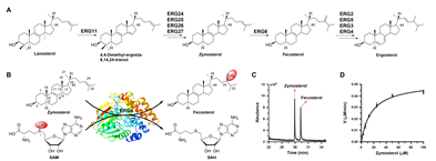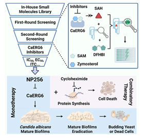 中国科学院成都生物研究所罗应刚课题组近期对植物、动物、微生物中甾醇的生物合成途径进行深入的比较与分析,选定甾醇24-C-甲基转移酶(CaERG6)作为抗真菌药物的潜在靶点。该工作优化、合成了CaERG6编码基因,在大肠杆菌中过量表达,并表征了其催化功能(图1)。建立了一个基于生物传感器的高通量筛选平台,从实验室小分子化合物库中经过2轮筛选,发现了四个羊毛甾醇型C31三萜类衍生物,确定为CaERG6抑制剂(图2)。其中NP256(palustrisoic acid E)是一种潜在的抗真菌天然小分子,它通过抑制麦角甾醇的生物合成,下调菌丝形成的基因表达水平,阻断生物膜的形成,并破坏白色念珠菌的形态转变(图3)。组合抗真菌试验表明,NP256能显著增强白色念珠菌对已知抗真菌药物的敏感性,可通过单药或联合用药来治疗白色念珠菌(图4)。