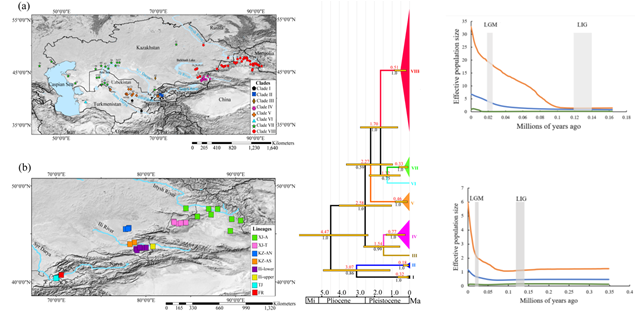 科研团队通过对旱地沙蜥的现存分布区全面调查,以覆盖其分布区的96个种群共300号个体,利用2个线粒体基因(CO1ND2),构建其谱系地理结构,进而追溯其群体历史动态,并模拟其适生分布区的变化。同时,对其中27个种群的51号个体,开展简化基因组GBS测序,生成SNPs数据。对联合的mtDNA数据进行分析, 得到8个地理上相关联的支系,大约447万年前(~4.47 Ma)在费尔干纳河谷开始最初的分化。然而,塔吉克斯坦的支系VP. helioscopus sergeevi,谢尔盖耶夫亚种)向费尔干纳的支系IIP. helioscopus saidalievi,赛达利耶夫亚种)有核基因的渐渗,从而引起线粒体-核基因不一致的进化式样。祖先区域重塑显示,旱地沙蜥起源于费尔干纳河谷,然后伴随着多次异域分化过程,散布到ACA地区。走出起源地费尔干纳后,分化速率加快。在晚上新世期间,整个中亚地区的干旱化加剧,可能促进了这种适应干旱的蜥蜴在这片广阔的区域快速辐射。随后,更新世期间的地质事件(如:希萨尔-阿莱山抬升、里海海进)和地理障碍(如:阿姆河、泽拉夫尚河)促进了旱地沙蜥的逐步分化。有趣的是,支系VIIIP. helioscopus varius, 准噶尔亚种)经历了快速的种群增长和适生分布区扩张,而支系IVP. helioscopus cameranoi, 伊犁亚种)在末次盛冰期(LGM)经历了急剧的种群扩张和适生分布区收缩。在支系IV而不是支系VIII中,环境变化对线粒体遗传分化的贡献大于地理距离。SNPs数据表明,地理距离比环境距离对遗传分化的贡献更大。mtDNASNPs数据一致表明,支系IVVIII有支系内的分化,分别揭示了伊犁河谷和准噶尔盆地的潜在地理障碍。研究发现,27SNPs离群位点与环境因素(降水和温度)相关,这支持了旱地沙蜥对干旱荒漠环境的局域适应。本研究还支持了将P. meridionalis(支系 I,南方沙蜥)和P. saidalievi (支系 II,赛达利耶夫沙蜥)从先前的亚种提升为种级地位。