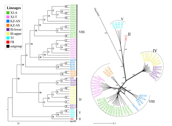基于SNPs数据的物种树(左)和系统发育网络(右)