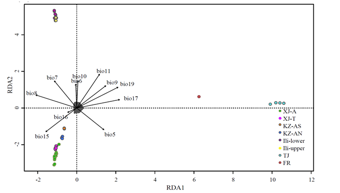 冗余分析所示气候变量和种群结构之间的关系。彩色点表示不同个体,颜色代表8个地理谱系。中间黑点是SNPs;黑色箭头代表气候变量。