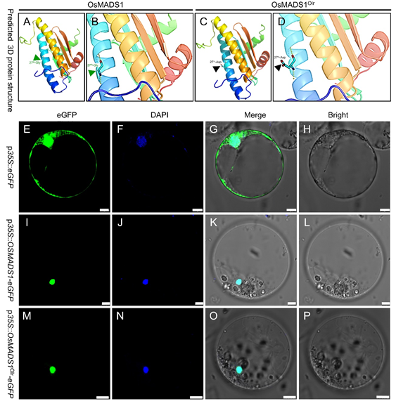 图2. OsMADS1野生型与OsMADS1Olr突变蛋白三维结构预测与亚细胞定位