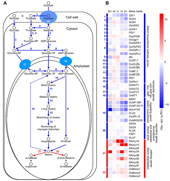 图3. 麦稻与日本晴种子淀粉代谢基因表达网络与基因表达分析