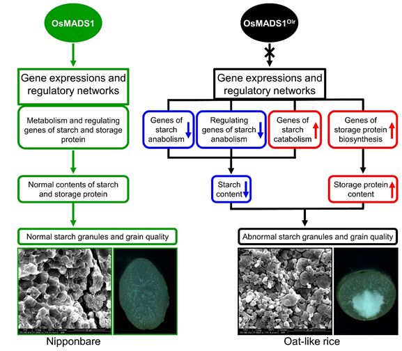 图4. OsMADS1基因调控稻米品质建成的分子机制模式图