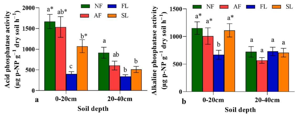 图1 不同土地利用方式土壤酸性(a)和碱性(b)磷酸酶活性