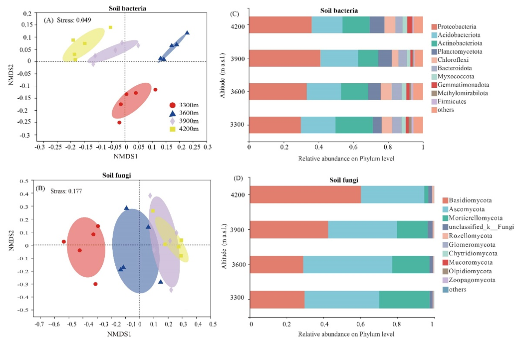 图1. 非度量多维尺度分析不同海拔下的根际土壤细菌和真菌群落