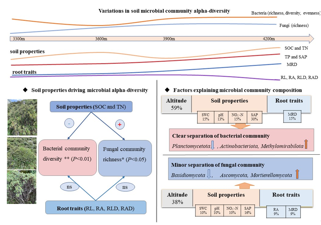 基于此,中国科学院成都生物研究所地表过程与生态系统管理项目组博士生谢路路和李琬婷在尹春英研究员的指导下,以折多山优势灌丛光亮杜鹃(Rhododendron nitidulum Rehd. et Wils)为研究对象,采集不同海拔(3300、2600、3900和4200米)的植物根系和土壤样品,利用高通量测序技术(Illumina MiSeq sequencing platform),阐明了不同海拔的根际土壤微生物群落变化格局及主要调控因素。研究表明:1)细菌群落丰富度和多样性随海拔增加呈先降低后增加的趋势,在3600米达到最小值;而海拔3300米处的真菌群落丰富度在显著低于其他海拔。2)不同微生物类群对环境的相应不同。在低海拔(3300和3600米),土壤养分有效性低,杜鹃具有更大的根系表面积,细菌类群中Planctomycetota占优势;而高海拔(3900和4200米)的土壤养分有效性高,杜鹃具有较低的根系表面积,真菌类群 中Mortierellomycota占优势。3)土壤含水量、pH 值、硝态氮和有效磷含量,和根系表面积和最大深度是解释根际土壤细菌和真菌群落变化的主要因素。本研究揭示了不同海拔杜鹃根际土壤微生物群落的分布格局及其驱动因子,加深了对高山灌丛生态系统的微生物学过程的理解。