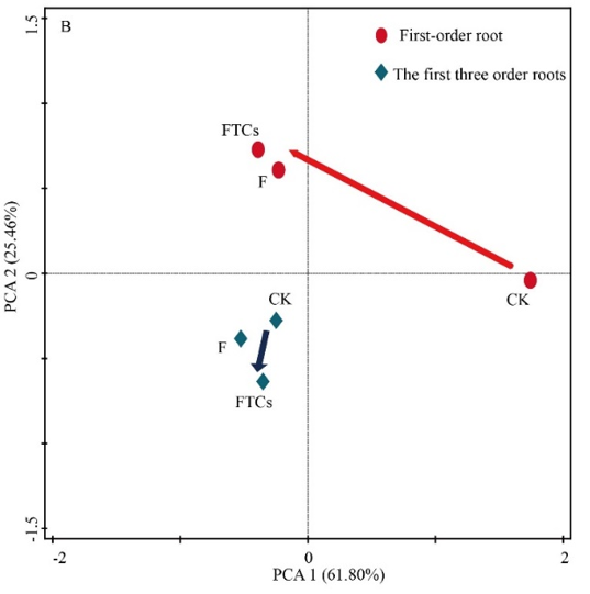 图2. 云杉1级根和前3级根生理特征对土壤冻融和冻结响应的主成分分析
