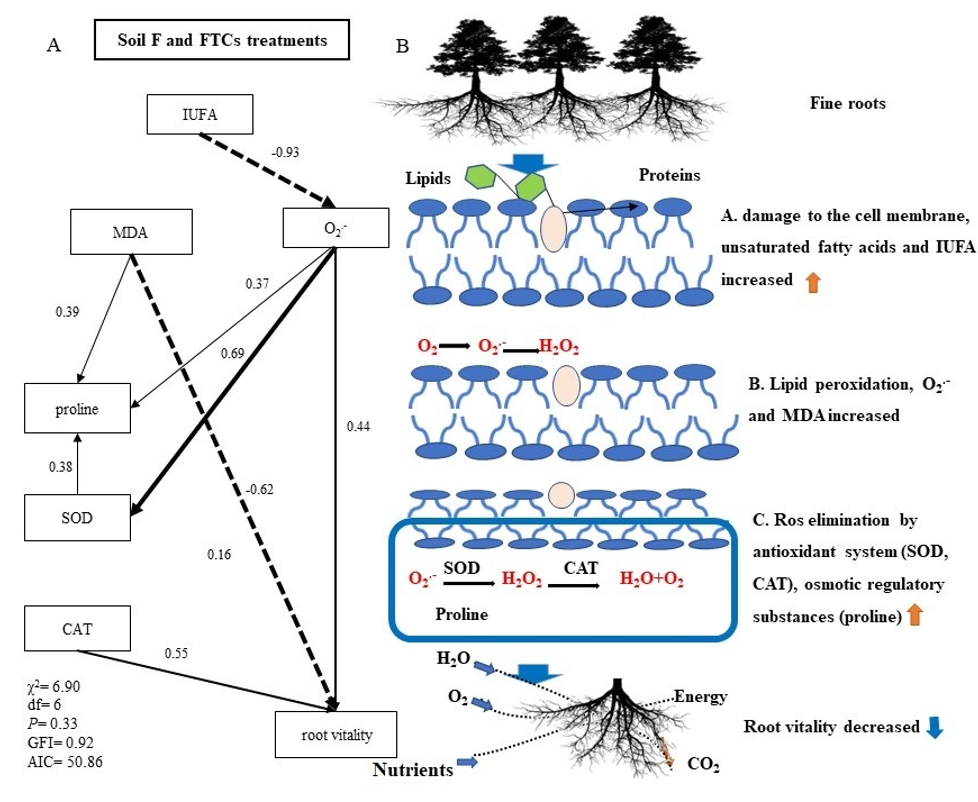 基于此,中国科学院成都生物研究所地表过程与生态系统管理项目组博士生谢路路在尹春英研究员的指导下,以西南亚高山优势针叶树种粗枝云杉(Picea asperata)为研究对象,采用室内控制实验模拟土壤冻结和冻融循环,依据根序分级理论和吸收根??楦拍?,以1级根和前3级根作为实验单元,探究了云杉不同根序细根对土壤冻结和冻融的差异响应。研究表明:1)土壤冻结和冻融破坏了细根的细胞膜结构,并降低了根系活力,增加了丙二醛和超氧阴离子自由基的产量。土壤冻融比冻结处理的效果更显著。2)低级细根可以看作是植物响应寒冷胁迫的敏感单元。土壤冻融和冻结胁迫下,细根通过增加不饱和脂肪酸含量、抗氧化酶活性、渗透调节物质和植物激素含量应对胁迫。3)因结构和生理活性原因,1级根比前3级根对土壤冻融/冻结的响应更敏感。本研究揭示了不同根序细根对土壤冻结和冻融的差异性生理响应,可加深对细根异质性的认识,为森林经营和管理提供依据。