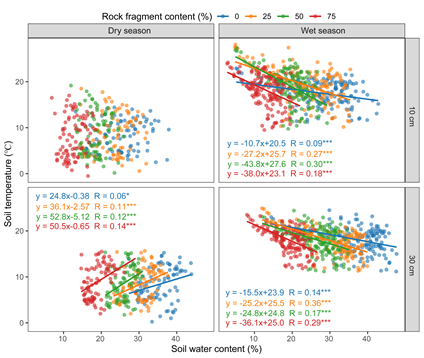 上述研究成果以“Rock fragment content alters spatiotemporal patterns of soil water content and temperature: Evidence from a field experiment”为题发表于Geoderma。成都生物研究所博士生黄龙、研究员包维楷、李芳兰等人参与了该研究工作。研究受国家自然科学基金(No. 32271654)和国家重点研发项目(2020YFE0203200)的联合资助。