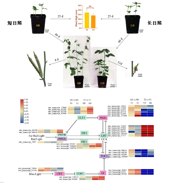 本研究基于Illumina RNA-seq,PacBio Iso-seq和UPLC-MS技术,分析长/短光周期对瓜尔豆开花结豆的影响,以期解析其机制。结果显示,许多基因对光周期有不同的响应,涉及节律、开花、生物合成和代谢途径。随着培养时间的增加,差异表达基因(DEGs)的数量从2518增加到5708。节律、开花以及关键转录因子如phyA、GI、ELF3、TOC1、NF-Y和GATA等对短日照正响应,而PRR、FLC、SVP、COL16和B3对短日照负响应,但对长日照正响应。此外,长日照抑制了与植物激素途径相关基因的表达,如赤霉素(GA)合成相关基因GA20ox和GA3ox, 茉莉酸(JA)合成基因AOS和ACX;相应地,GA和JA的水平降低,表明它们在瓜尔豆开花中具有重要的调控功能。有趣的是,光周期不影响半乳甘露聚糖合成基因的表达。