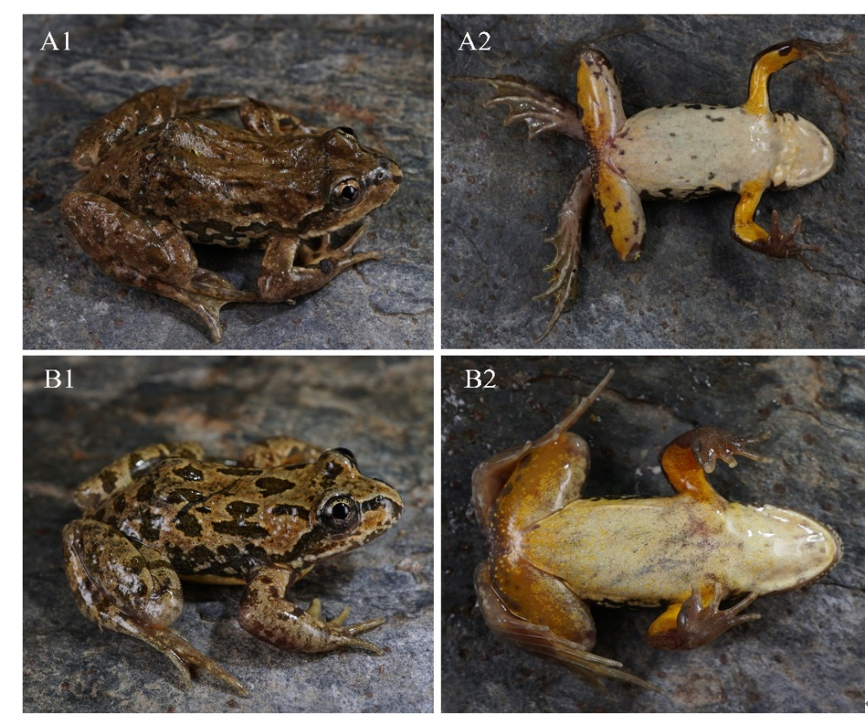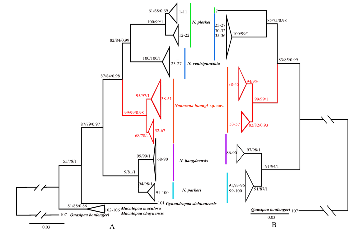 近年来,中国科学院成都生物研究所江建平团队对倭蛙属(sensu stricto Nanorana进行了野外调查与样本采集、分子系统发育关系的构建,以及分类厘订,研究结果(图1,图2,图3)发现采自云南省兰坪县、玉龙县和大理市的倭蛙为一新种,命名为黄腹倭蛙N. huangi,该种的模式产地为兰坪县。兰坪县的倭蛙此前记录为腹斑倭蛙,玉龙县和大理市为本次调查新发现的倭蛙分布地。该新种的形态鉴别特征为:1)体长中等, 成体雄性体长为 31.3-40.6 mmn = 12,成体雌性体长为 39.2-48.1 mmn = 8;2)无指关节下瘤,趾基下瘤小而明显;(3)背部深色斑无浅色边缘,腹部乳黄色,四肢腹面鲜黄色;4)鼓膜小而明显,呈圆形;5)后肢前伸贴体时胫跗关节达鼓膜或肩部;(6) 头长达体长的30。基于线粒体12S,16S,CO1基因片段构建的系统发育关系树(图3)表明:黄腹倭蛙为一个单系,且与腹斑倭蛙和倭蛙组成的支系为姐妹群关系,分支节点支持率高。