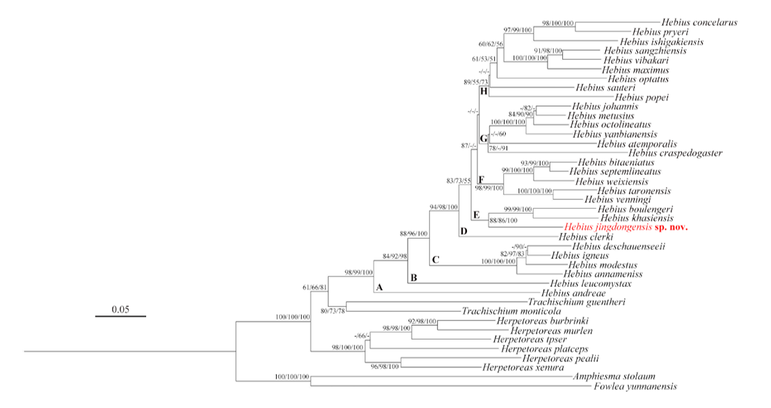 中国科学院成都生物研究所江建平研究员课题组于20177月在云南省普洱市景东彝族自治县的野外调查中采集到1号东亚腹链蛇属物种标本(图1&2),该标本在形态上与同属其它已知物种差异明显,未发现可与其在形态上吻合的已知种。基于线粒体Cyt b基因片段构建的系统发育关系树(图3)表明该号标本构成了一个由卡西腹链蛇H. khasiensis与白眉腹链蛇H. boulengeri所构成支系的姐妹支系,且分支节点的支持率很高;该号标本与已知的东亚腹链蛇属物种的遗传分化明显(基于Cyt b的遗传距离为9.5%–14.8%),表明其可能代表了一个新物种。