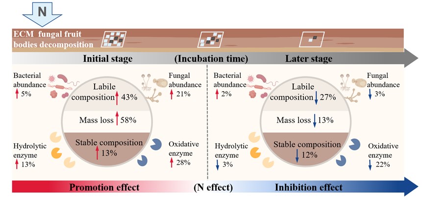 基于此,中国科学院成都生物研究所森林生态过程与调控项目组尹华军研究团队,以ECM高度共生的西南山地典型针叶林---华山松(Pinus armandi)为研究对象,以ECM外延菌丝为切入点,以林下常见的两种ECM真菌子实体(牛肝菌属,Boletus和红菇属,Russula)为研究载体,采用自制的分解袋原位模拟ECM菌丝分解,依托团队建立的模拟氮沉降(低氮:25 kg N /ha/yr;高氮:50 kg N /ha/yr)试验样地,通过长达20周的原位监测ECM真菌子实体质量和组分的损失,揭示了ECM菌丝分解动态对氮添加的响应模式;同步测定了土壤微生物特性,以确定ECM菌丝分解动态的潜在微生物调控机制。研究结果表明:I)两种ECM真菌子实体分解对N添加表现出一致的响应模式,均呈现前期促进和后期抑制两个效应截然相反的阶段;II)前期促进阶段主要归因于N添加加速了ECM真菌子实体中活性组分的损失,后期抑制阶段主要是由N添加缓解了这些活性组分的损失并同时增加了惰性组分的保留所导致的; )N添加对ECM真菌子实体分解的早期促进效应与微生物群落丰度和水解酶活性的增加密切相关,而后期抑制效应主要与真菌群落丰度和氧化酶活性的降低有关。上述结果表明,ECM真菌菌丝分解动态对N添加的响应与分解阶段密切相关,为大气N沉降下ECM真菌周转及其生态反馈提供了新的见解。