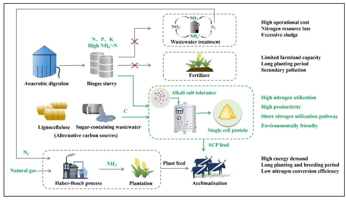 沼液,作为厌氧消化的主要副产物,其含有各种氨基酸、挥发酸和氮、磷、钾等元素,其中氨氮(NH4+-N)含量占总氮的60%以上。传统上将沼液作为肥料施用于农田,但沼气工程周边农田土壤承载力有限、易造成二次污染且蛋白获取周期长。沼液可被当作污水进行处理,但成本较高,也是对氮资源的一种浪费,还产生大量污泥。沼液中的高浓度氨氮是一种潜在的廉价氮源,利用微生物将其回收生产SCP,可实现氨氮一步转化为蛋白质。中国科学院成都生物研究所生物质能源项目组前期挖掘了大量SCP生产菌,如脱氮副球菌(Paracoccus denitrificans )和善变副球菌(Paracoccus versutus)、产朊假丝酵母(Candida utilis)、蜂蜜酵母(Nectaromyces rattu)和白地霉(Galactomyces candidum),进行了大量的技术研发,并获得多项授权发明专利。