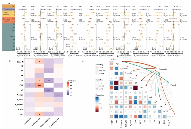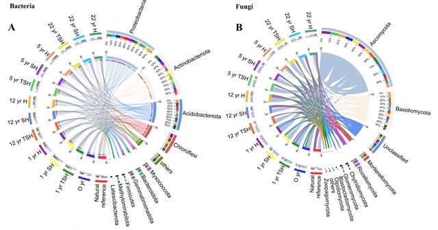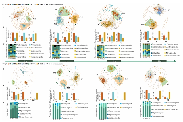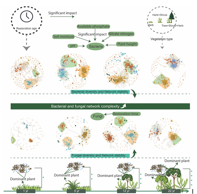 为此,中国科学院成都生物研究所地表过程与生态系统管理项目组博士王敏(已毕业)等人在庞学勇研究员指导下,研究了青藏高原东部不同道路边坡的草、灌-草、和乔-灌-草配置模式下土壤微生物恢复动态,结合植物和土壤性质,揭示了不同恢复阶段和不同植被类型下道路边坡生态恢复对土壤微生物多样性及网络复杂性的影响。结果表明,与采用不同植被类型相比,恢复时间对微生物多样性的影响更为显著。随着恢复的进行,微生物网络复杂性和真菌多样性增加,但细菌多样性下降,这表明微生物关键类群可能对网络复杂性有重要贡献。细菌网络复杂性增加的同时,网络模块数却在下降,这可能会影响微生物群落的稳定性。在不同的恢复阶段,不同的植被类型与对恢复敏感的微生物群落密切相关,其中,豆科植物和固氮植物(如 Albiziak alkora、Ginkgo biloba、Rhus chinensis、 Rhapis excels和 Rubia cordifolia )在恢复5年后均表现出与关键微生物极强的相关性。这些关键类群包括Proteobacteria、Actinobacteria、Chloroflexi、Gemmatimonadota和Myxococcota等。我们还发现,细菌的 多样性与恢复时间、土壤pH、水分、有效磷、硝态氮以及植株高度密切相关,而真菌 多样性则主要受恢复时间的影响。综上所述,我们的研究结果表明可以通过调节土壤理化性质、环境因素、植被配置模式和优势物种管理特定关键微生物类群的丰度来引导生态恢复的轨迹。