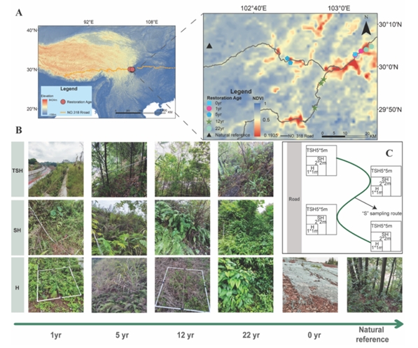 随着人类活动导致生物多样性和生态系统服务功能丧失的持续增加,人们加大了对退化生态系统恢复的努力。大型工程建设导致大量裸露边坡,极大地影响了土壤理化性质以及植物和土壤生物多样性。为逆转道路边坡生态系统的退化趋势,传统上人们倾向于采用植被恢复和土壤改良等手段,往往忽视了微生物在恢复过程中发挥的作用,而土壤微生物对于调节地上和地下的养分循环和维持生态系统稳定至关重要。我们对于这些传统恢复手段在不同植物配置模式下土壤微生物多样性和网络复杂性的长期影响仍缺乏深入了解,这正是导致生态系统恢复效果不佳的重要原因之一。