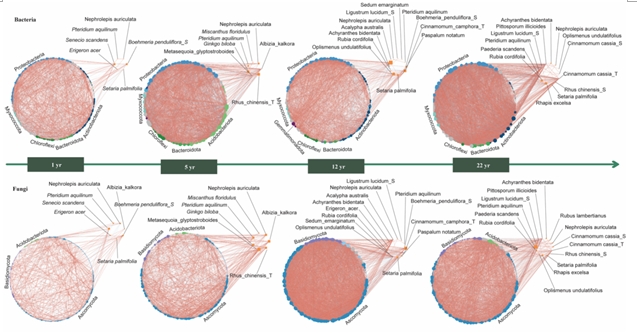 不同恢复年限优势植物与其微生物直连节点的共现网络