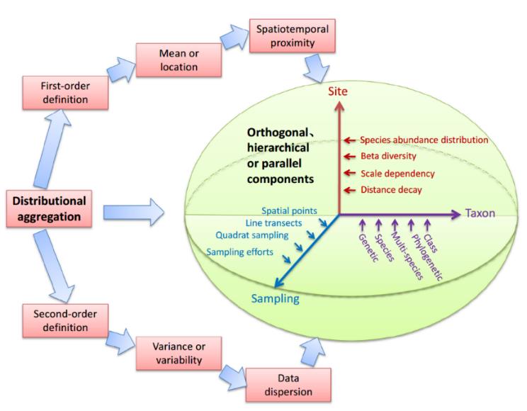 物种分布是生物多样性呈现的基本模式之一,在大多数情况下,物种在空间上的分布呈现某种程度的聚集。因此,生态学和进化生物学家普遍使用“分布聚集”(Distributional aggregation)一词来描述物种在空间和时间上的非随机分布。然而,随着研究情景与观察视角的多样化,“分布聚集”一词被赋予了越来越多的含义,具有丰富的内涵,但是这也导致了不同生态学研究领域的学者对其有不同理解,可能会阻碍分布聚集理论和模型的进一步发展和实际应用。因此,亟需一个理论框架对“分布聚集”的定义进行规范,并能够统一或连接不同研究场景下其多样化的含义。