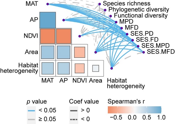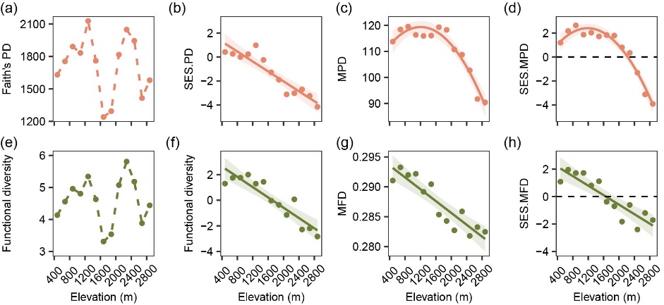 ?结果表明:(1)物种、系统发育和功能α多样性均呈双峰分布,在控制物种丰富度的影响后,系统发育和功能多样性的标准化效应值随海拔呈现由正到负的趋势,暗示群落构建的主导力量可能由竞争排斥转为环境过滤(图2);(2)年均温、年降雨和面积是α多样性海拔梯度格局形成的重要驱动因子(图3);(3)除嵌套组分外,鸟类群落的相似性随着海拔和环境距离的增加而减?。ㄍ?/span>4)。本研究通过整合物种、系统发育、功能三个维度的α和β多样性,为理解山地系统鸟类群落构建机制提供了实证,为山地系统的生物多样性?;す婊峁┝死砺壑С?。该研究成果近期以“Elevational patterns and assembly processes of multifaceted bird diversity in a subtropical mountain system”为题发表于生物地理学经典期刊Journal of Biogeography。博士生林皓贤、博士后汪晓意为论文共同第一作者,胡军华研究员为通讯作者。研究得到了国家自然科学基金、中国科学院“西部之光”交叉团队等项目的资助。?