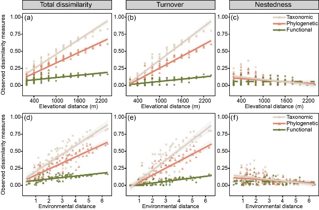 ?阐明生物多样性的空间格局及其构建机制是全球变化下生态学、?;ど镅Ш蜕锏乩硌У闹匾蒲侍狻I降叵低骋蚱浞岣欢捞氐纳锒嘌院蜕镉敕巧镆蛩亟恢傻母丛踊肪?,成为了研究生物多样性格局和形成机制的理想系统,但这种复杂性也为全面理解生物多样性格局和形成机制带来了挑战。近年来,学者们逐渐意识到单一视角的研究并不足以概括生物多样性的全貌及其背后复杂的形成与维持机制。因此,采用一种全面的视角来研究生物多样性——不仅关注生物种类(即α多样性),还包括群落间的物种组成差异(即β多样性)。β多样性帮助我们理解不同地区间群落组成的差异,这些差异由物种的替换(周转)和物种丰富度的变化(嵌套)来表现。通过将β多样性分解为周转和嵌套组分,能让我们更好地了解不同生态过程如何影响群落组成。随着功能多样性和系统发育多样性研究的发展,整合不同维度(物种、系统发育和功能)和不同层次(α和β)的多样性能更好地绘制生物多样性沿地理和环境梯度的图景、解析群落构建机制,为生物多样性研究与?;ぬ峁└娴氖咏呛托碌乃悸?。?