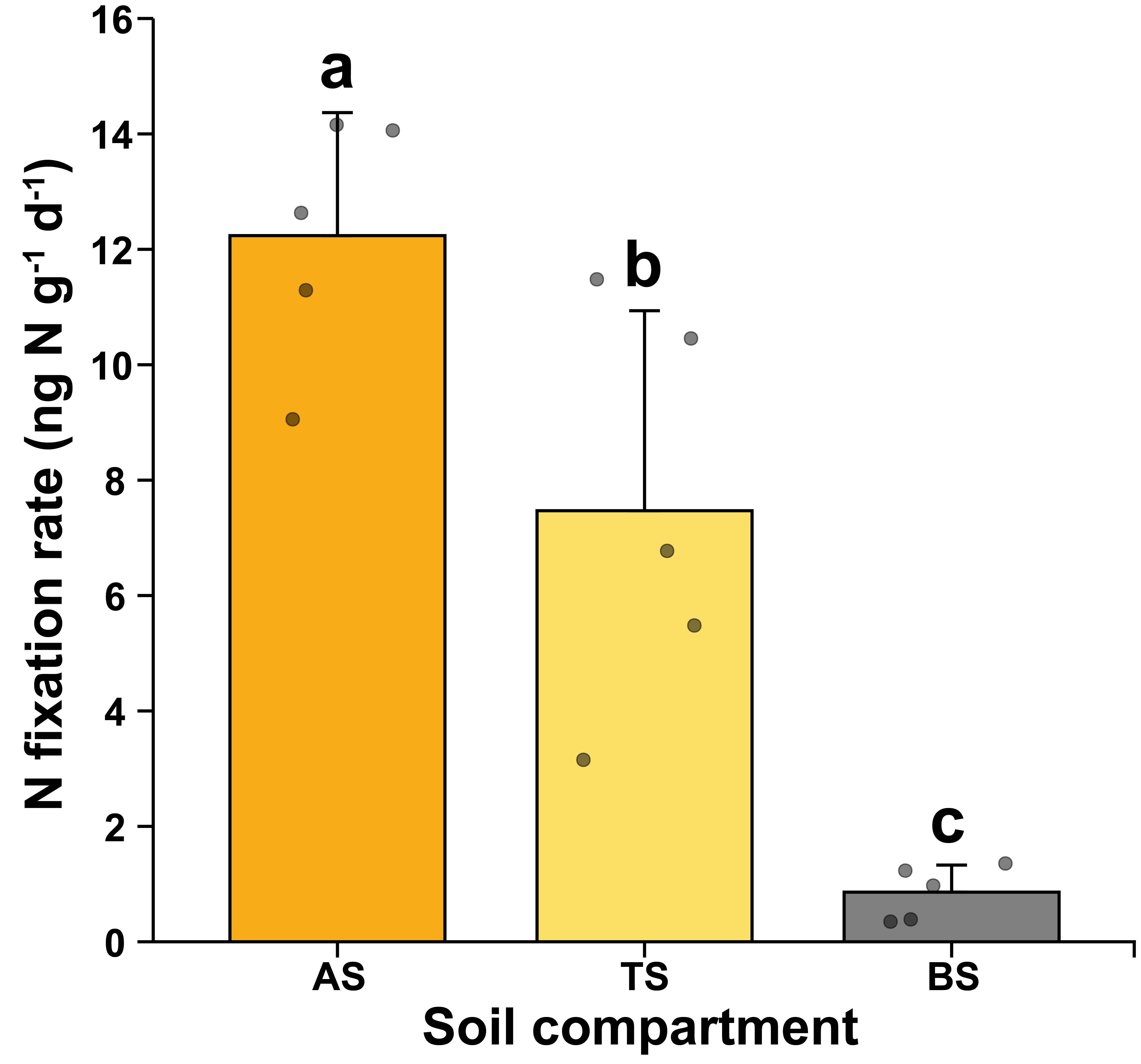 Fig. 1不同土壤模块(吸收根根际、运输根根际、非根际)的非共生固氮速率差异
