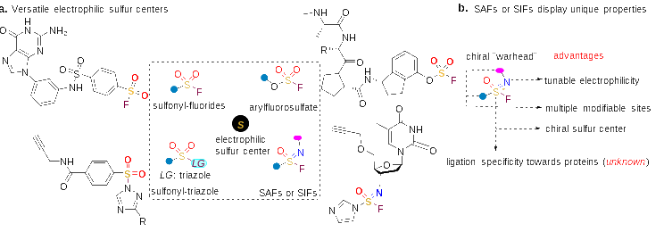 化学蛋白质组学是一种重要的技术,可用于可视化、分离或操纵内源性未知蛋白质组。通过共价探针的方法,化学蛋白质组学可以用来筛选和发现潜在的药物靶点,或者识别并调节蛋白质。近年来,利用六价硫官能团,如磺酰氟(-SO2F)、氧磺酰氟(-OSO2F)和磺亚胺酰氟(SAF)等硫中心的亲电性,并基于第二代“点击化学”—硫氟交换反应(SuFEx),与蛋白质中的亲核性残基,如半胱氨酸或赖氨酸等,发生共价连接,选择性地靶向特定类型的蛋白质,发展了多种有效的探针或共价药物。