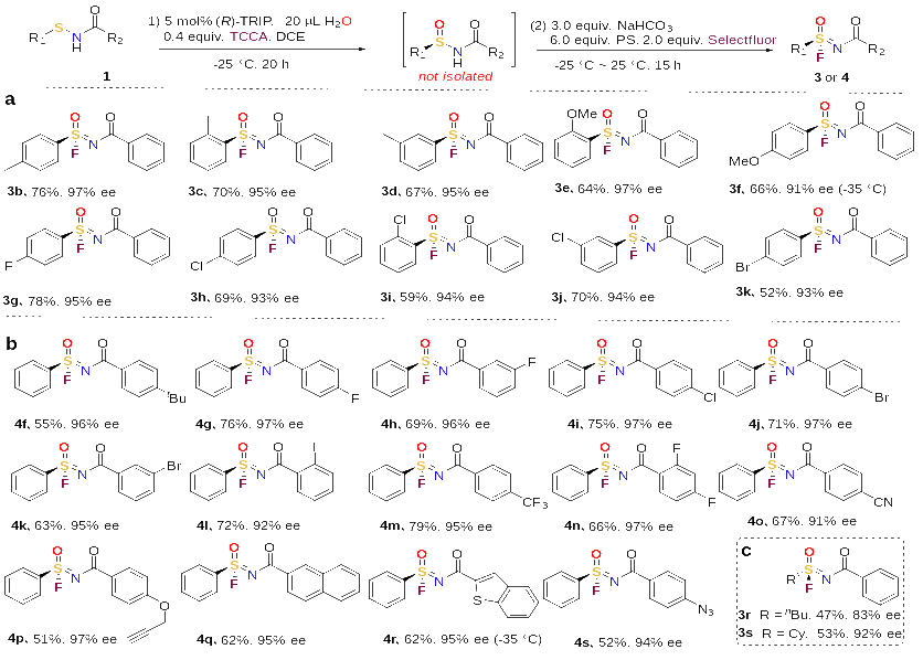 首先,作者以次磺酰胺1aa作为模板底物对反应条件进行优化,在最优条件下能够以75%的收率和97%的ee值获得SIFs产物3a。接下来,作者对合成SIFs的底物适用范围进行了考察。在该反应条件下,不论是硫方面的或是酰胺方面中,具有一系列供电子或吸电子取代基的苯环或杂环、稠环均能兼容该反应,能以中等至良好的产率和优异的对映选择性得到所需的SIFs。