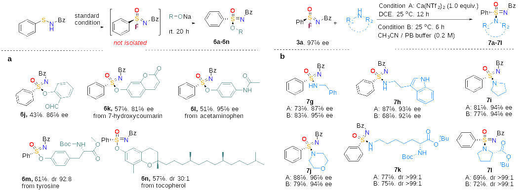 在此基础上,得到的手性SIFs能进一步在温和条件下或在缓冲溶液中转化为多种手性S(VI)衍生物。这些化合物在药物化学、材料化学等领域中都有广泛的应用。值得注意的是,在SIFs与酚类化合物反应中,能够采取“一锅法”从次磺酰胺直接合成手性磺亚胺酯。另外,在构建手性磺亚胺酰胺时,能同时在有机相或者水相中进行,且对映选择性能得到很好的保持。