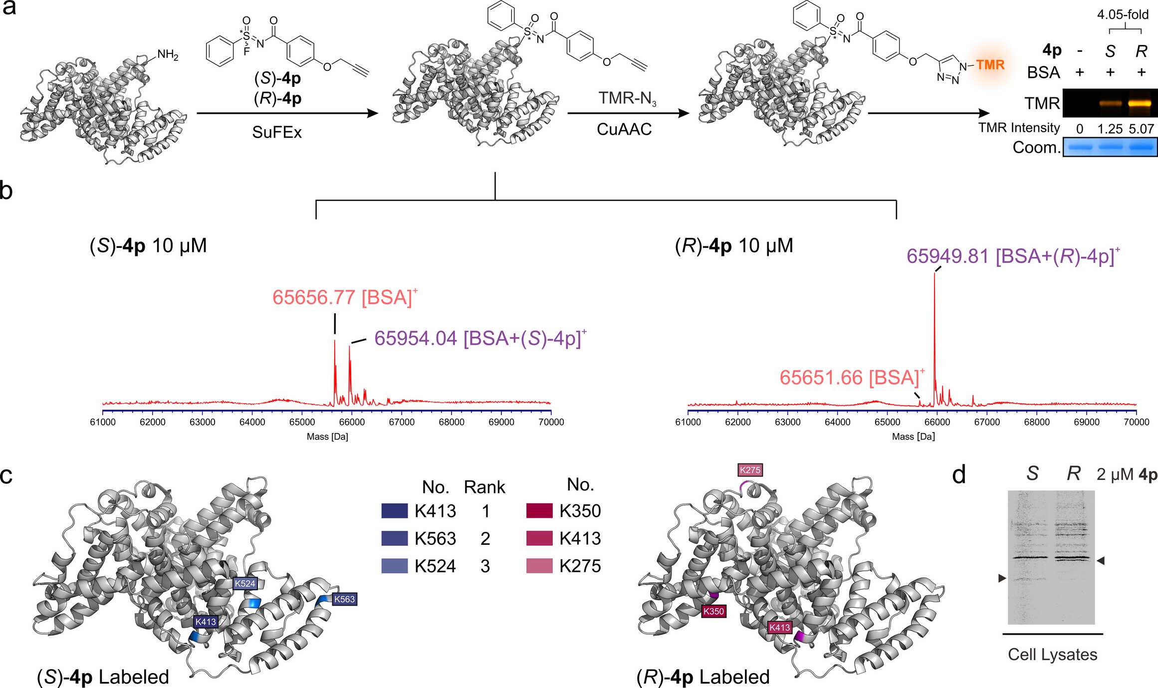 为了探索SIFs与蛋白质偶联的立体特异性SuFEx反应,作者将4p的两种对映体与牛血清白蛋白BSA进行孵化。显著的是,作者观察到4p的两个对映体对BSA有着不同反应性,其中(R)-4p表现出与BSA更大的结合倾向。同样的,4p的两种对映体与人类组蛋白ASF1A的孵化中也观察到了类似的结果。通过串联MS进一步分析偶联的特异性,发现两种构型所标记的赖氨酸不完全一样。这些结果表明硫原子中心手性在识别蛋白质内不同结合口袋的关键作用。